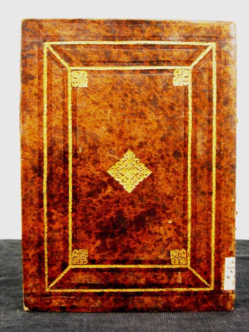Cuoio marrone marmorizzato, decorato a secco ed in oro. Filetti concentrici a secco. Coppia di cornici dorate, realizzate a rotella, raffigurano motivi fogliati entro filetti ondivaghi. Al centro dei piatti, una cartella costituita da quattro fregi di genere orientaleggiante addossati, ripetuti singolarmente al centro dei piatti. Dorso liscio. Capitelli assenti. Taglio grezzo. Carte di guardia marmorizzate nere e marroni.