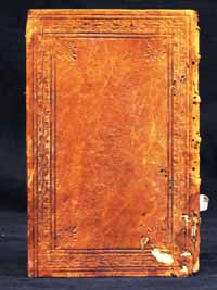 Bazzana nocciola con lievi perdite di sostanza, decorata a secco. Cornice a due coppie di filetti, decorate a rotella, raffigura rami fogliati ondivaghi avvolti attorno ad un'asta. Un fiorone negli angoli interni. Dorso dal materiale di copertura scomparso in testa e al piede, a cinque nervi rilevati. Nel secondo compartimento, un tassello in cuoio recita "DE/VANIT/SACIENT"; in quelli rimanenti, una losanga azzurrata. Capitelli scomparsi. Taglio grezzo. Carte di guardia marmorizzate e bianche. Rimbocchi non visibili.