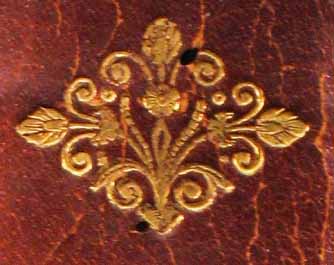 Legatura francese (?) di dedica del primo (?) quarto del secolo XIX in cuoio rosso e verde a grana lunga di cartone decorata a secco, in oro ed a mosaico. Coppia di filetti concentrici a secco. Cornice perlata dorata decorata internamente con delle greche. Al centro del piatto anteriore, un cartiglio ellittico in cuoio verde reca l'iscrizione A M