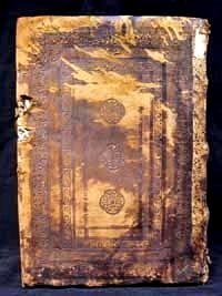 Cuoio marrone dalle diffuse spellature, decorato a secco. Piatti indeboliti lungo le cerniere. Angoli ricurvi. Fasci di filetti concentrici. Cornice esterna ed interna a piastrella, raffigurano rispettivamente, motivi ad arabesco e volute stilizzate. Al centro dello specchio, tre cartelle latamente circolari, disposte verticalmente, ciascuna delle quali costituita da quattro fregi a quarto d'angolo, di foggia orientaleggiante, ripetuti singolarmente negli angoli. Tracce di quattro bindelle in pelle allumata. Dorso a tre nervi rilevati. Cuoio parzialmente scomparso al piede. Alette orizzontali cartacee di rinforzo in carta. Capitelli grezzi. Compartimenti ornati con due bande di volute stilizzate; coppia di filetti obliqui intrecciati. Taglio grezzo. Rimbocchi rifilati con discreta cura; angoli giustapposti.