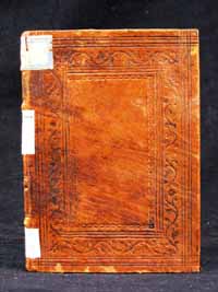 Cuoio nocciola con tracce di spellatura, decorato a secco. Due fasci di filetti concentrici. La cornice ornata a rotella, raffigura delle volute provviste di foglie di vite e di grappoli d'uva. Margine interno dello specchio caratterizzato da un motivo a torciglione. Dorso quattro nervi rilevati. Nel secondo compartimento, campeggia un tassello in cuoio nero con l'iscrizione "VIT/S./ANT". Capitelli in policromia. Carte bianche. Taglio grezzo. Rimbocchi rifilati con discreta cura; quelli laterali sono collocati sopra i rimbocchi di testa e di piede.