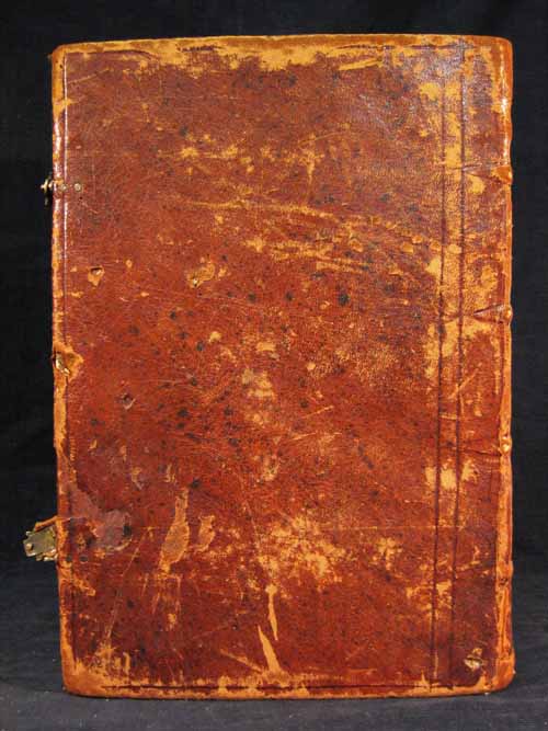 Cuoio marrone con spellature diffuse e gocce di cera, decorato a secco. Cornice ad un filetto, raddoppiato lungo il dorso. Coppia di fermagli, caratterizzati da una coppia di bindelle - distacco in atto per quella superiore- con puntale a forma di palmetta provvista di un occhiello destinato a fissarsi sul rispettivo tenone. Dorso a quattro nervi rilevati. Capitelli e taglio grezzi. Carte di guardia bianche. Rimbocchi rifilati con discreta cura; quelli laterali sono collocati sopra i rimbocchi di testa e di piede.