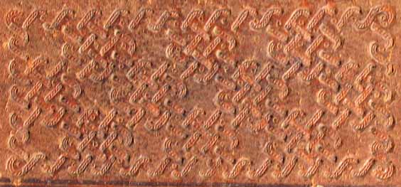 Legatura su cui sono stati applicati i piatti di una legatura in marocchino marrone dal fiore in gran parte scomparso, su assi, decorato a secco. Angoli dei piatti sbrecciati. Coppia di fasci di filetti concentrici, collegati negli angoli. Cornice decorata con nodi di tipo moresco. Specchio caratterizzato da barrette diritte e ricurve. Sul piatto anteriore, traccia della base di fissaggio di una bindella; su quello posteriore, quella di una contrograffa lanceolata. Dorso mobile, a due nervi, poco rilevati. Capitelli e taglio grezzi. Carte di guardia bianche, rifatte, e membranacee. Sul verso della carta di guardia anteriore membranacea, è disegnato uno scudo di tipo italiano. Rimbocchi rifilati con cura; angoli giustapposti.