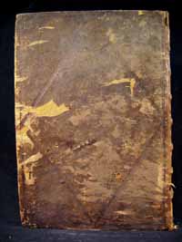 Cuoio marrone dal fiore scomparso e con perdita di sostanza, decorato a secco. La cornice a due filetti delimita la losanga a motivi fogliati. Fioroni filigranati e fioriti. Dorso a sette nervi rilevati. Capitelli e taglio grezzi. Carte di guardia membranacee. Rimbocchi rifilati senza particolare cura; quelli laterali sono posti sopra i rimbocchi di testa e di piede.