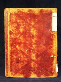 Cuoio marrone con tracce di spellature e di gore brune, decorato a secco. Coppia di rettangoli disposti verticalmente, caratterizzati da una coppia di filetti obliqui incrociati. Tracce di due coppie di bindelle in pelle allumata. Dorso liscio a tre nervi in pelle allumata. Capitelli assenti. Taglio grezzo. Carte di guardia anteriore bianca, con una filigrana dalle lettere "3-C" ed una rosetta al piede entro un cerchio, sormontata da un trifoglio stilizzato; il testo evidenzia una filigrana a foggia di testa di toro, sormontata da uno stelo con in testa, tre foglie stilizzate. Rimbocchi rifilati senza particolare cura; quelli laterali sono collocati sotto i rimbocchi di testa e di piede.