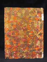 2 lavorate a pettine, caratterizzate dal colore rosso dominante sul fondo, oltre alle tinte giallo, bianco, azzurro e verde: esse sono stese a strisce di larghezza media al centro, e si vanno assottigliando alle estremità. Nelle carte decorate prodotte secondo questa tecnica, si manifestano spesso anche delle spirali e delle onde. Gli elevati valori di unghiatura, fino a 12 mm lungo il taglio di gola, testimoniano il riutilizzo della coperta.