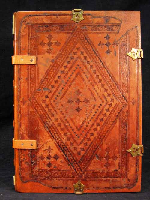 Legatura su cui sono stati applicati i piatti di una coperta rinascimentale bergamasca in marocchino marrone decorato a secco. Tre filetti concentrici. Una cornice esterna a stelline, ripetute al centro dei piatti e negli angoli; interna a piastrella, raffigura volute fogliate. Nello specchio, una losanga delimitata da quattro filetti, ornata con cornici a: 1) torciglione; 2) losanghe dai lati concavi; 3) crocette. Negli angoli, mazzi di quattro stelline. Quattro fermagli, costituiti da bindelle rifatte con puntale e contrograffa pentalobata zigrinata a tre cerchielli vuoti e con finestrella di aggancio laterale. Dorso a quattro nervi rilevati con due listelle di sostegno in cuoio. Capitelli e taglio grezzi. Carte di guardia bianche, rifatte. Restauro P. Brena e C. Valli, Bergamo.